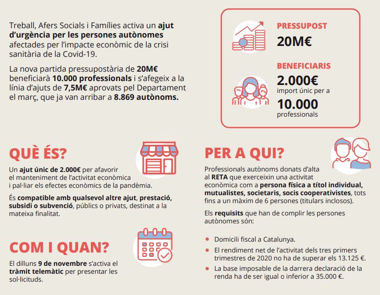 Las personas trabajadoras autónomas dadas de alta en el RETA, o bien a una mutualidad como sistema alternativo al RETA, socias de una empresa con personalidad jurídica propia (de un máximo de 3 socios). No podrán solicitar la ayuda las empresas con personalidad jurídica que el sumatorio de personas socias y personas trabajadoras sea superior a 6 (media del año 2019).